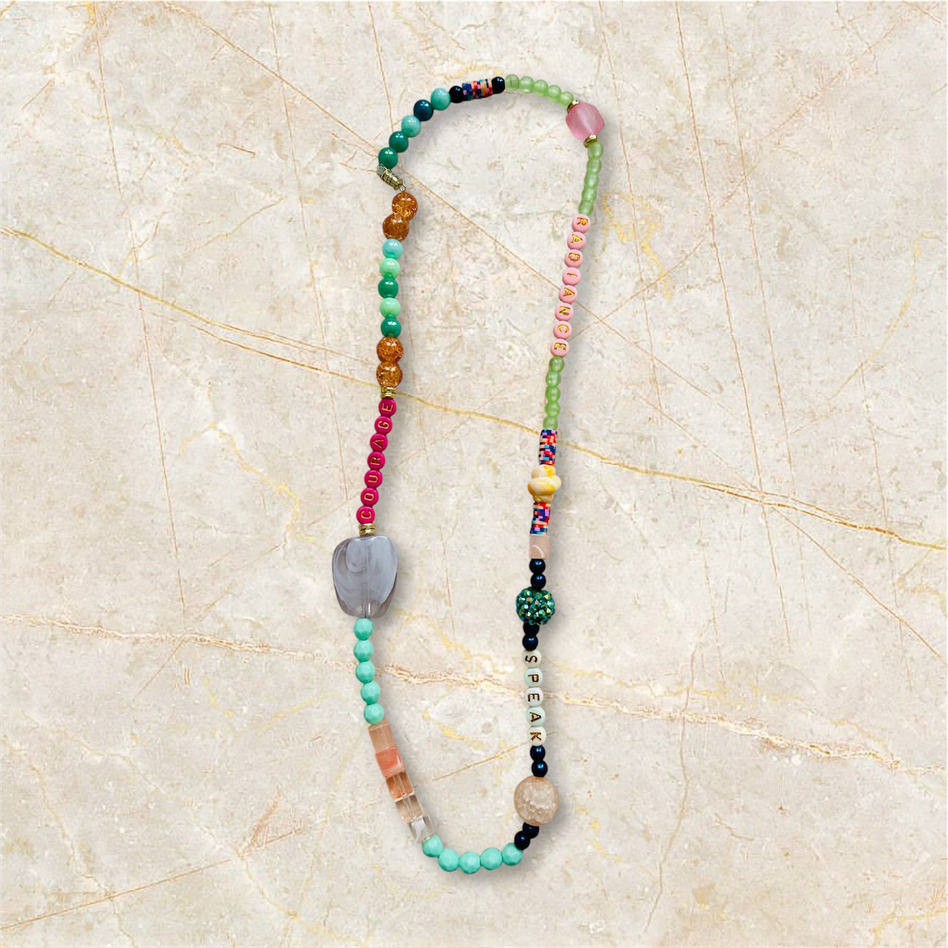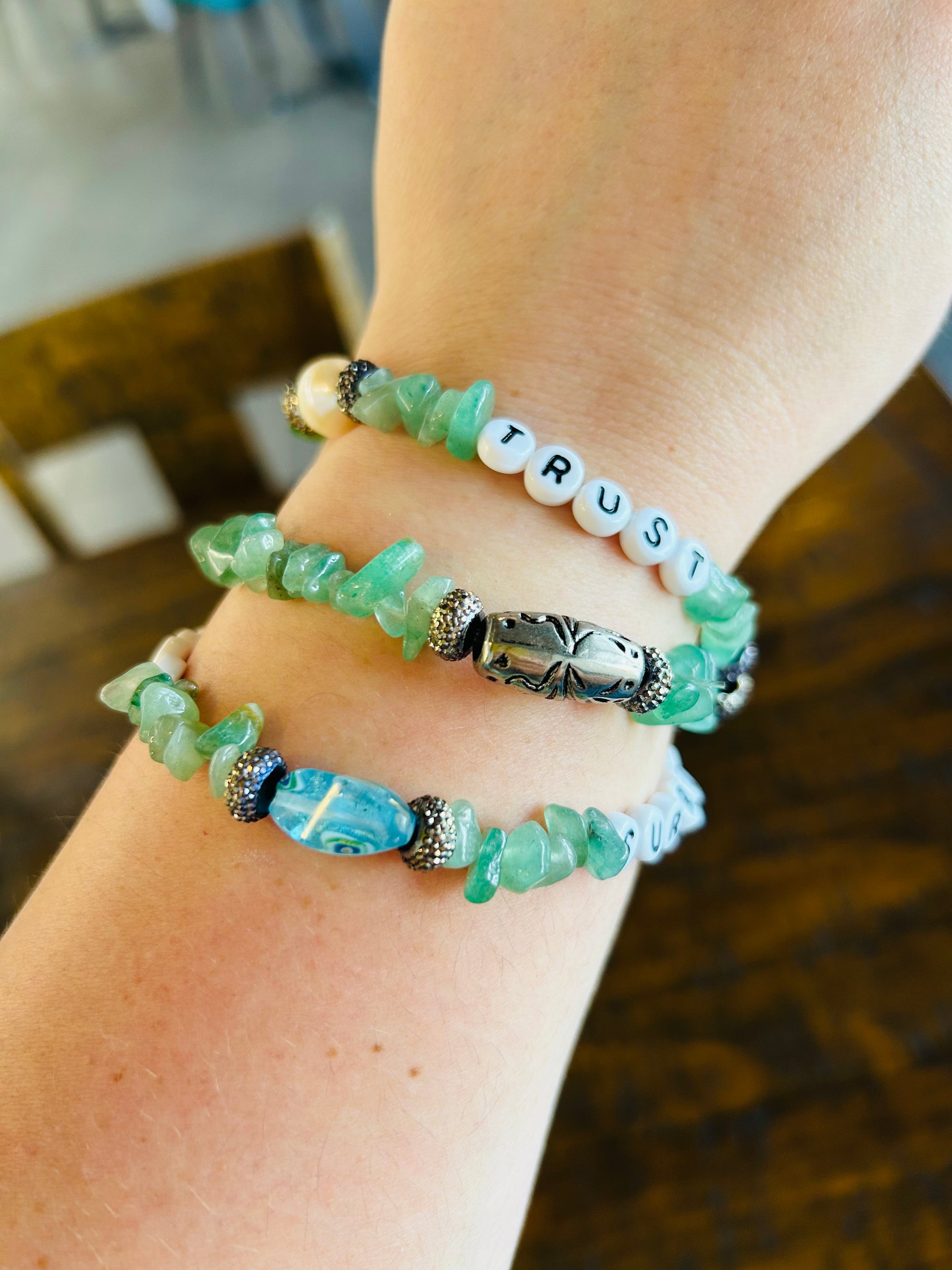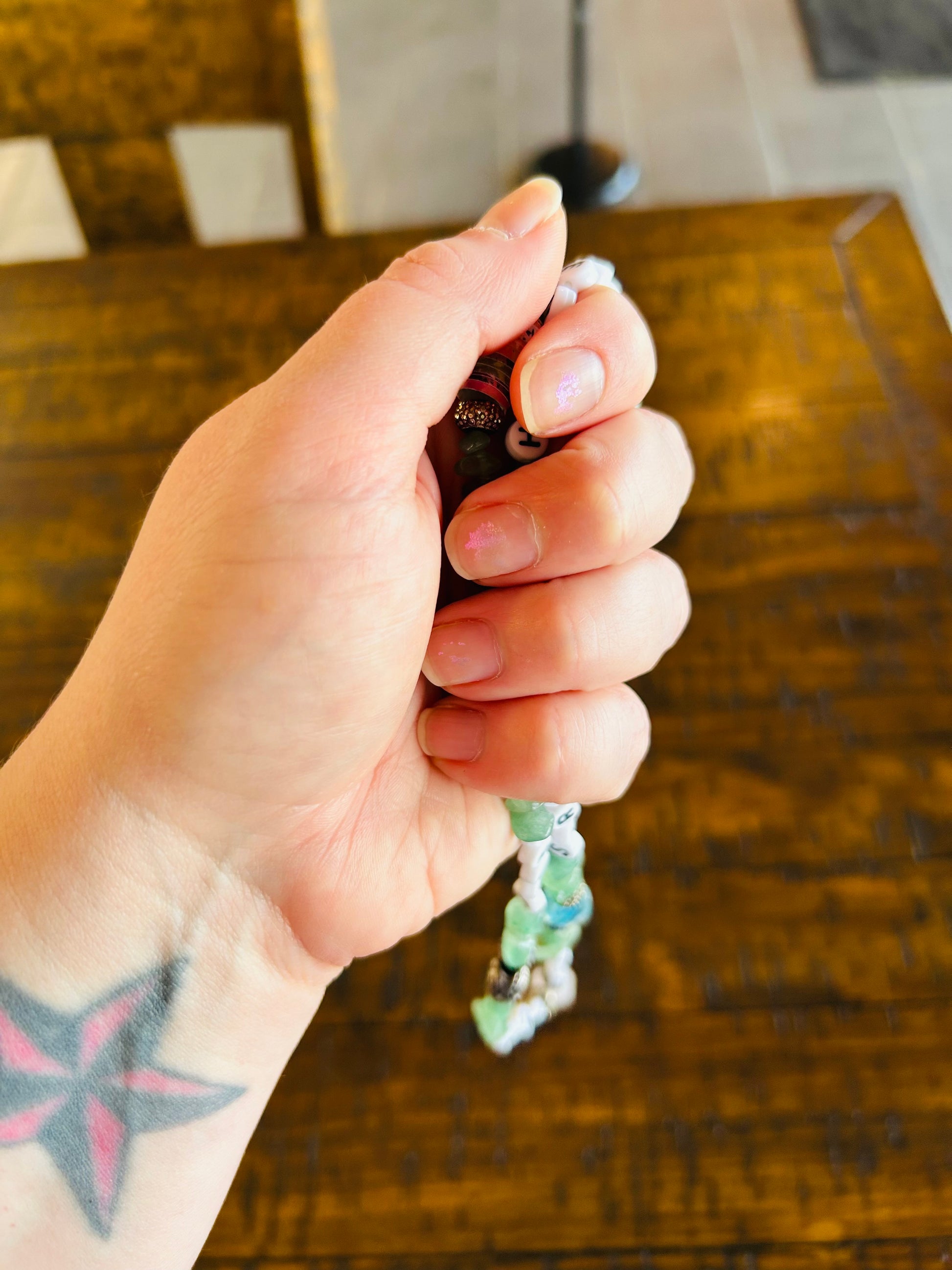 An updated version of prayer beads. Almost like an adult version of a teddy bear. Something you can bring with you during hard moments where you have to find inner strength. These beads keep a mantra for you. Able to customize colors, words & theme.